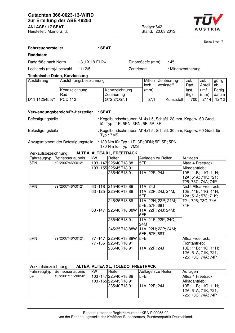 Dieses Gutachten (ABE) bezieht sich auf die Alufelge Momo EUROPE in der Ausführung 8Jx18 ET 0, Mittenloch 0 mm (KBA 49250). Im PDF findest du typischerweise zulässige Reifengrößen, Auflagen/Anbauhinweise und – je nach Dokument – Hinweise zur Eintragung.