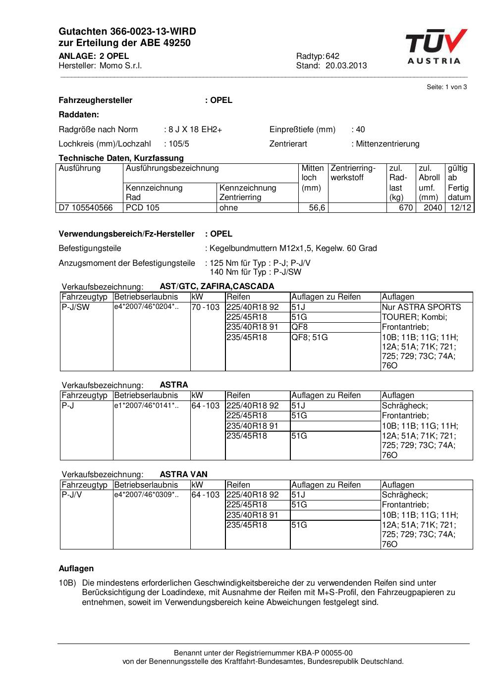 Dieses Gutachten (ABE) bezieht sich auf die Alufelge Momo EUROPE in der Ausführung 8Jx18 ET 0, Mittenloch 0 mm (KBA 49250). Im PDF findest du typischerweise zulässige Reifengrößen, Auflagen/Anbauhinweise und – je nach Dokument – Hinweise zur Eintragung.