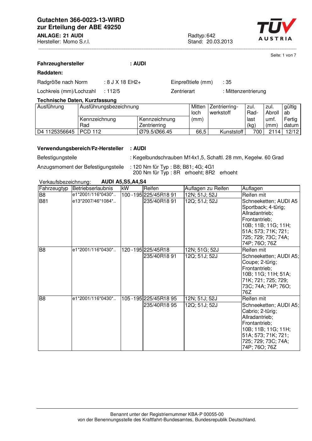Felgengutachten / ABE für Alufelgen Momo EUROPE (8Jx18 ET 0, Mittenloch 0 mm) mit KBA 49250 (Zertifikatsnummer 366-0023-13-WIRD__Anlage_21). Hier kostenlos als PDF herunterladen. Der Download-Link ist 24 Stunden gültig und kann bis zu zwei Mal verwendet werden.