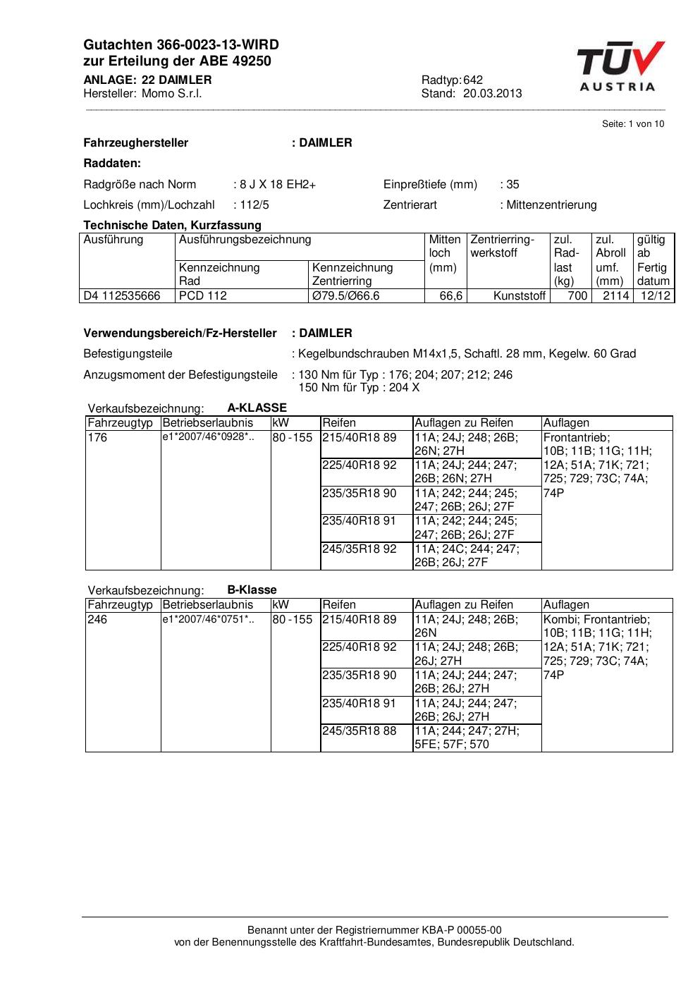 Dieses Gutachten (ABE) bezieht sich auf die Alufelge Momo EUROPE in der Ausführung 8Jx18 ET 0, Mittenloch 0 mm (KBA 49250). Im PDF findest du typischerweise zulässige Reifengrößen, Auflagen/Anbauhinweise und – je nach Dokument – Hinweise zur Eintragung.