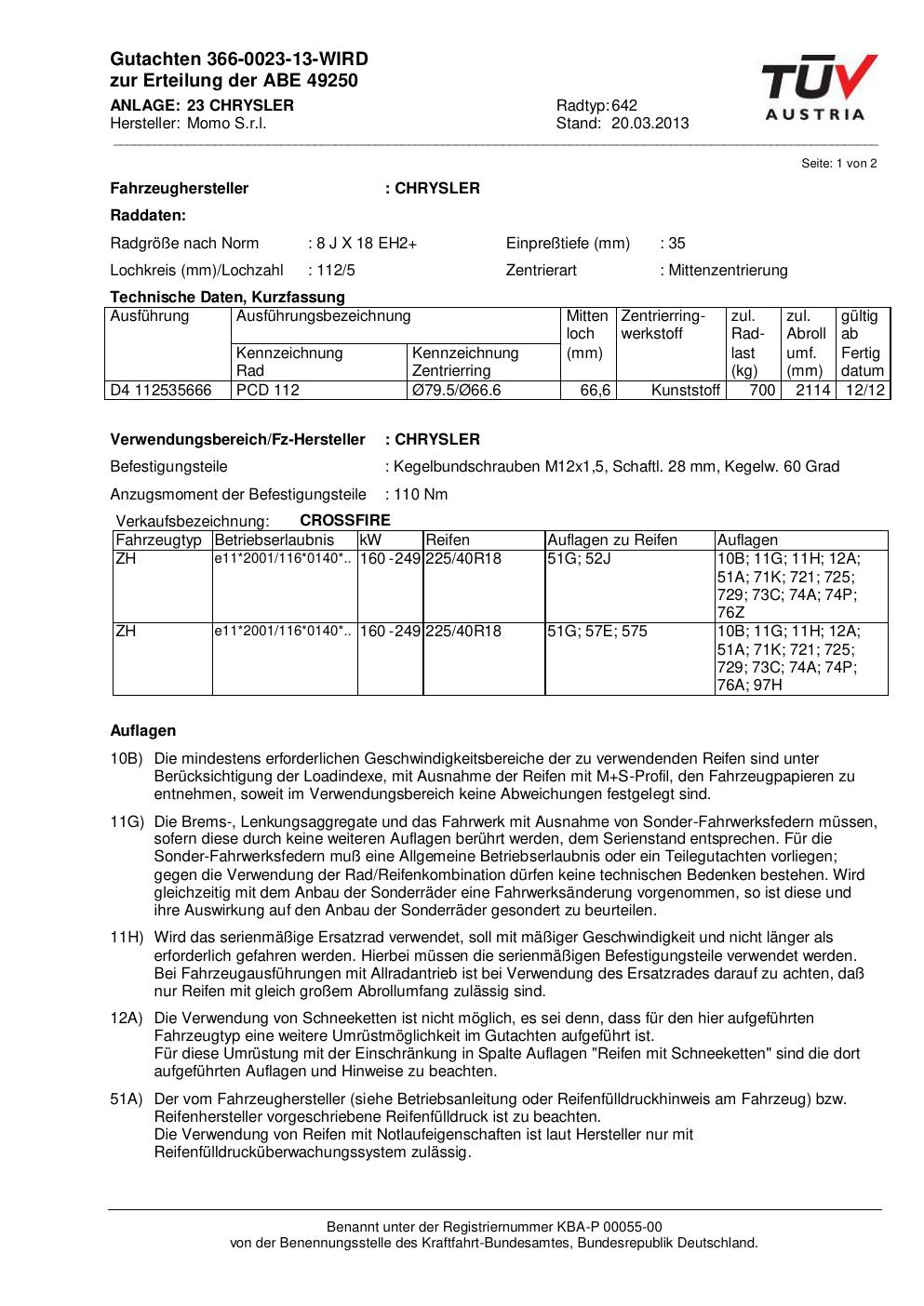 Felgengutachten / ABE für Alufelgen Momo EUROPE (8Jx18 ET 0, Mittenloch 0 mm) mit KBA 49250 (Zertifikatsnummer 366-0023-13-WIRD__Anlage_23). Hier kostenlos als PDF herunterladen. Der Download-Link ist 24 Stunden gültig und kann bis zu zwei Mal verwendet werden.