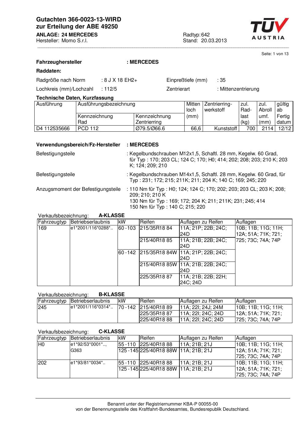Felgengutachten / ABE für Alufelgen Momo EUROPE (8Jx18 ET 0, Mittenloch 0 mm) mit KBA 49250 (Zertifikatsnummer 366-0023-13-WIRD__Anlage_24). Hier kostenlos als PDF herunterladen. Der Download-Link ist 24 Stunden gültig und kann bis zu zwei Mal verwendet werden.