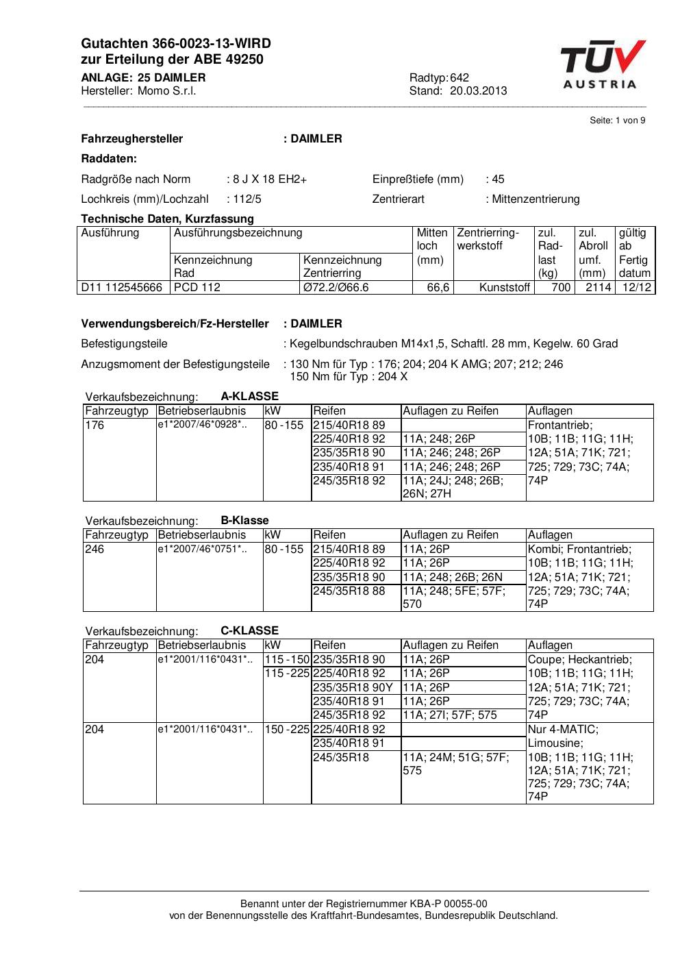 Dieses Gutachten (ABE) bezieht sich auf die Alufelge Momo EUROPE in der Ausführung 8Jx18 ET 0, Mittenloch 0 mm (KBA 49250). Im PDF findest du typischerweise zulässige Reifengrößen, Auflagen/Anbauhinweise und – je nach Dokument – Hinweise zur Eintragung.