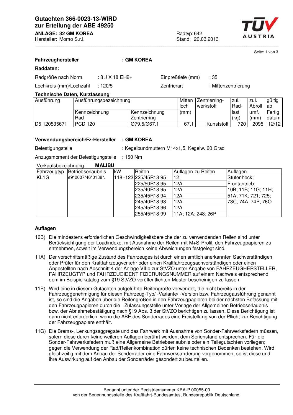 Dieses Gutachten (ABE) bezieht sich auf die Alufelge Momo EUROPE in der Ausführung 8Jx18 ET 0, Mittenloch 0 mm (KBA 49250). Im PDF findest du typischerweise zulässige Reifengrößen, Auflagen/Anbauhinweise und – je nach Dokument – Hinweise zur Eintragung.