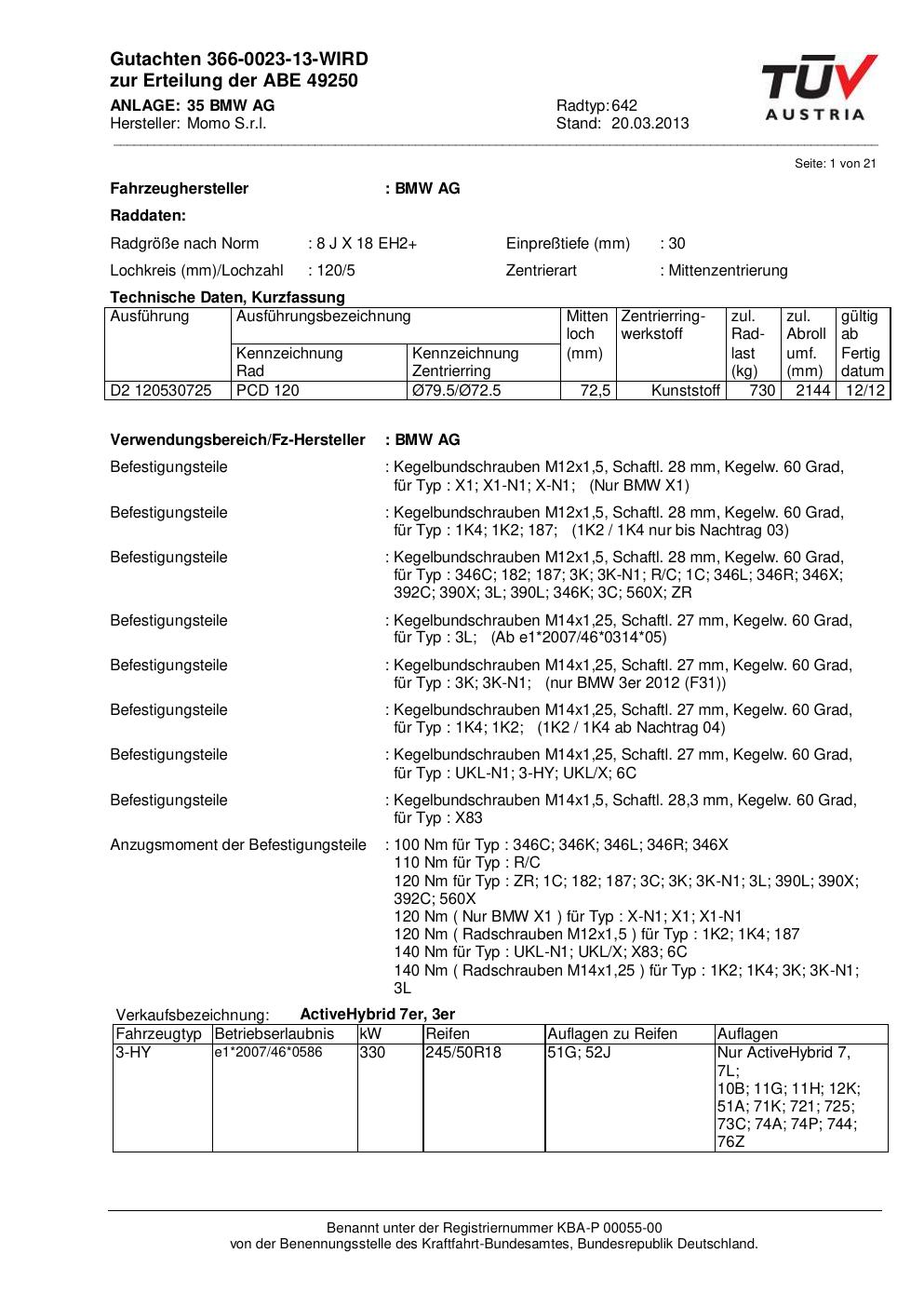 Felgengutachten / ABE für Alufelgen Momo EUROPE (8Jx18 ET 0, Mittenloch 0 mm) mit KBA 49250 (Zertifikatsnummer 366-0023-13-WIRD__Anlage_35). Hier kostenlos als PDF herunterladen. Der Download-Link ist 24 Stunden gültig und kann bis zu zwei Mal verwendet werden.