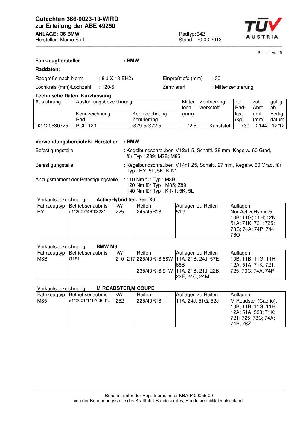 Felgengutachten / ABE für Alufelgen Momo EUROPE (8Jx18 ET 0, Mittenloch 0 mm) mit KBA 49250 (Zertifikatsnummer 366-0023-13-WIRD__Anlage_36). Hier kostenlos als PDF herunterladen. Der Download-Link ist 24 Stunden gültig und kann bis zu zwei Mal verwendet werden.