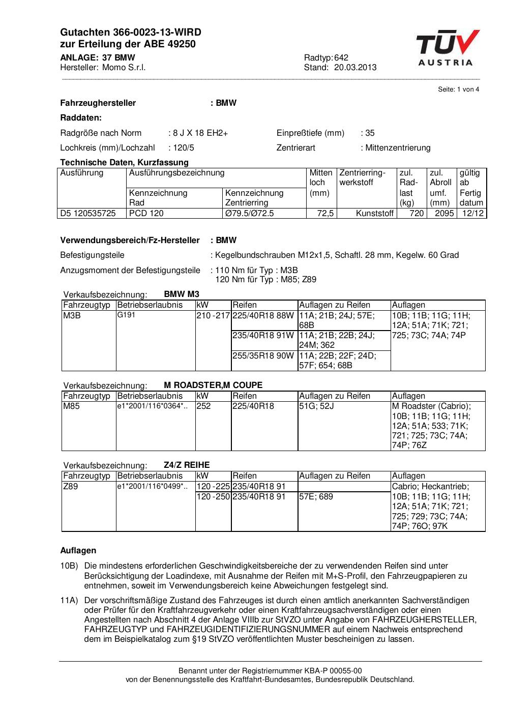 Dieses Gutachten (ABE) bezieht sich auf die Alufelge Momo EUROPE in der Ausführung 8Jx18 ET 0, Mittenloch 0 mm (KBA 49250). Im PDF findest du typischerweise zulässige Reifengrößen, Auflagen/Anbauhinweise und – je nach Dokument – Hinweise zur Eintragung.