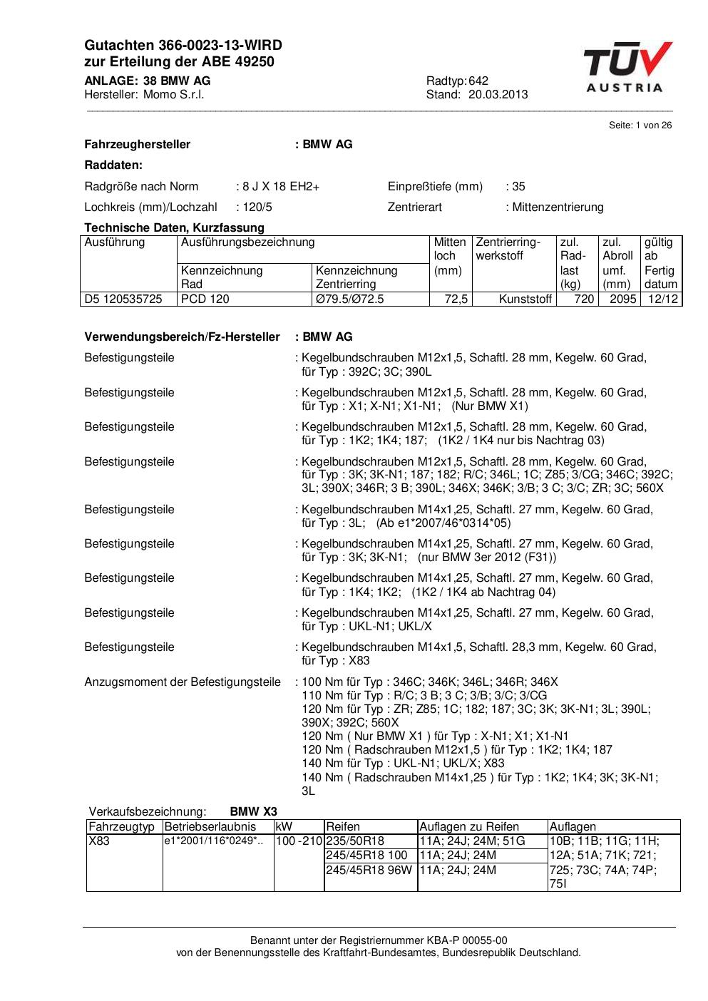 Felgengutachten / ABE für Alufelgen Momo EUROPE (8Jx18 ET 0, Mittenloch 0 mm) mit KBA 49250 (Zertifikatsnummer 366-0023-13-WIRD__Anlage_38). Hier kostenlos als PDF herunterladen. Der Download-Link ist 24 Stunden gültig und kann bis zu zwei Mal verwendet werden.