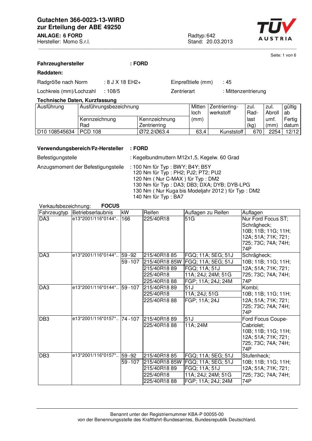 Felgengutachten / ABE für Alufelgen Momo EUROPE (8Jx18 ET 0, Mittenloch 0 mm) mit KBA 49250 (Zertifikatsnummer 366-0023-13-WIRD__Anlage_6). Hier kostenlos als PDF herunterladen. Der Download-Link ist 24 Stunden gültig und kann bis zu zwei Mal verwendet werden.