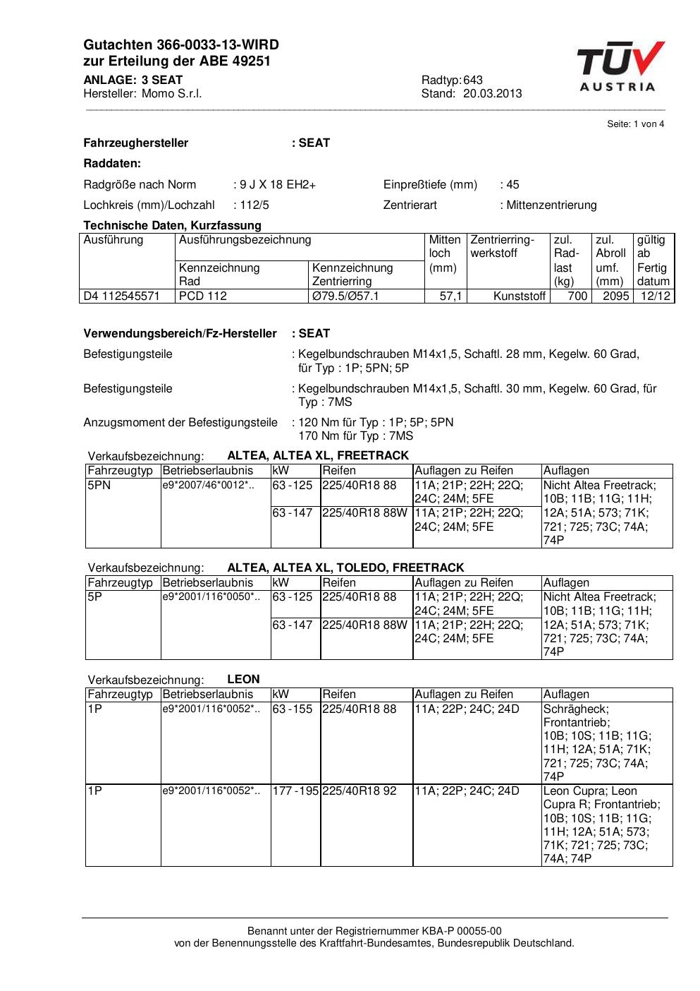 Dieses Gutachten (ABE) bezieht sich auf die Alufelge Momo EUROPE in der Ausführung 9Jx18 ET 0, Mittenloch 0 mm (KBA 49251). Im PDF findest du typischerweise zulässige Reifengrößen, Auflagen/Anbauhinweise und – je nach Dokument – Hinweise zur Eintragung.
