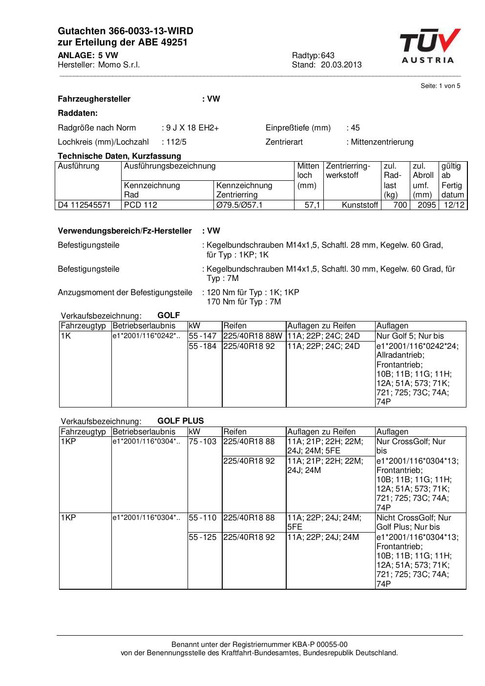 Felgengutachten / ABE für Alufelgen Momo EUROPE (9Jx18 ET 0, Mittenloch 0 mm) mit KBA 49251 (Zertifikatsnummer 366-0033-13-WIRD__Anlage_5). Hier kostenlos als PDF herunterladen. Der Download-Link ist 24 Stunden gültig und kann bis zu zwei Mal verwendet werden.