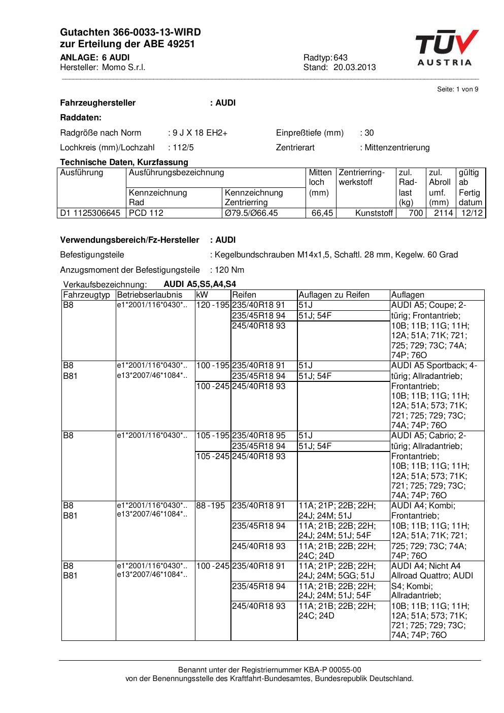 Felgengutachten / ABE für Alufelgen Momo EUROPE (9Jx18 ET 0, Mittenloch 0 mm) mit KBA 49251 (Zertifikatsnummer 366-0033-13-WIRD__Anlage_6). Hier kostenlos als PDF herunterladen. Der Download-Link ist 24 Stunden gültig und kann bis zu zwei Mal verwendet werden.