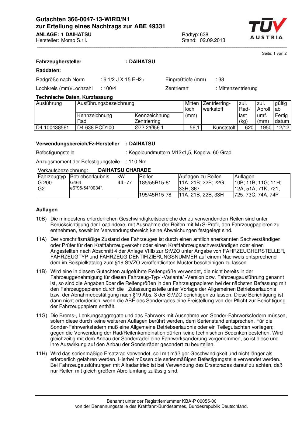 Felgengutachten / ABE für Alufelgen Momo EUROPE (6.5Jx15 ET 0, Mittenloch 0 mm) mit KBA 49331 (Zertifikatsnummer 366-0047-13-WIRD/N1__Anlage_1). Hier kostenlos als PDF herunterladen. Der Download-Link ist 24 Stunden gültig und kann bis zu zwei Mal verwendet werden.