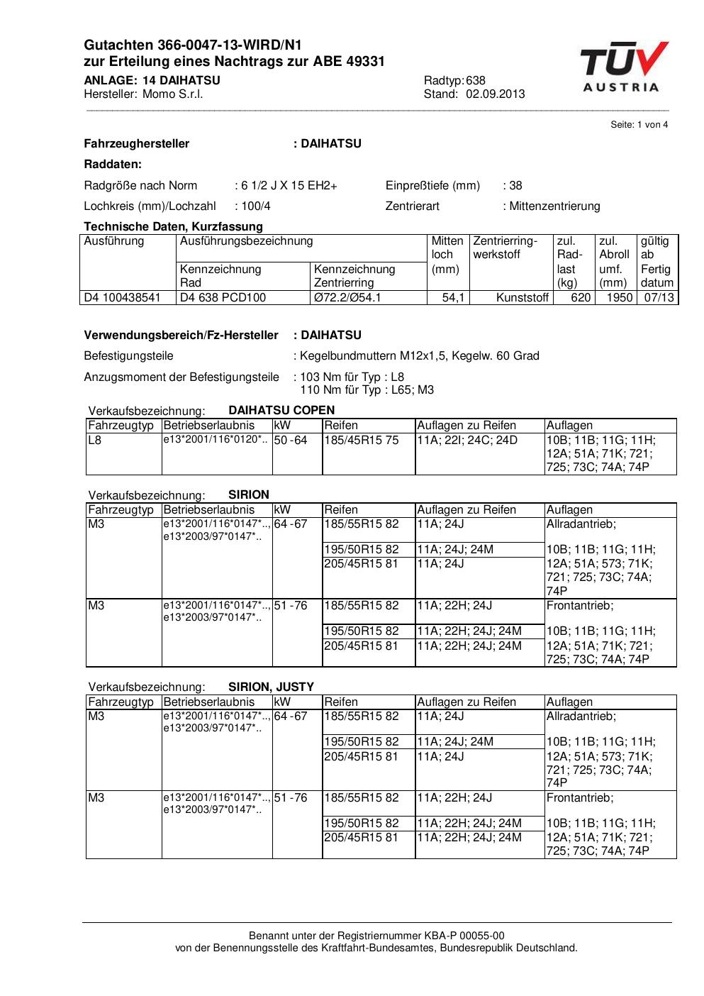 Felgengutachten / ABE für Alufelgen Momo EUROPE (6.5Jx15 ET 0, Mittenloch 0 mm) mit KBA 49331 (Zertifikatsnummer 366-0047-13-WIRD/N1__Anlage_14). Hier kostenlos als PDF herunterladen. Der Download-Link ist 24 Stunden gültig und kann bis zu zwei Mal verwendet werden.