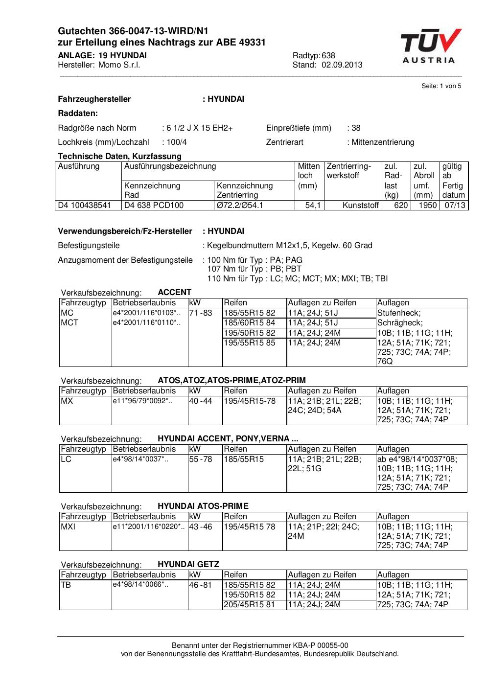 Felgengutachten / ABE für Alufelgen Momo EUROPE (6.5Jx15 ET 0, Mittenloch 0 mm) mit KBA 49331 (Zertifikatsnummer 366-0047-13-WIRD/N1__Anlage_19). Hier kostenlos als PDF herunterladen. Der Download-Link ist 24 Stunden gültig und kann bis zu zwei Mal verwendet werden.