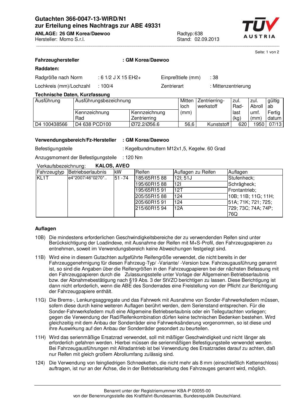 Felgengutachten / ABE für Alufelgen Momo EUROPE (6.5Jx15 ET 0, Mittenloch 0 mm) mit KBA 49331 (Zertifikatsnummer 366-0047-13-WIRD/N1__Anlage_26). Hier kostenlos als PDF herunterladen. Der Download-Link ist 24 Stunden gültig und kann bis zu zwei Mal verwendet werden.