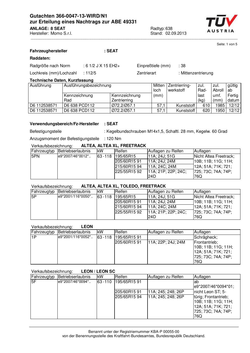 Felgengutachten / ABE für Alufelgen Momo EUROPE (6.5Jx15 ET 0, Mittenloch 0 mm) mit KBA 49331 (Zertifikatsnummer 366-0047-13-WIRD/N1__Anlage_8). Hier kostenlos als PDF herunterladen. Der Download-Link ist 24 Stunden gültig und kann bis zu zwei Mal verwendet werden.
