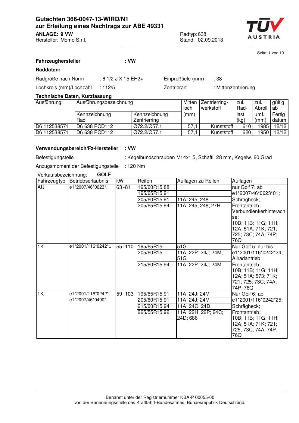 Felgengutachten / ABE für Alufelgen Momo EUROPE (6.5Jx15 ET 0, Mittenloch 0 mm) mit KBA 49331 (Zertifikatsnummer 366-0047-13-WIRD/N1__Anlage_9). Hier kostenlos als PDF herunterladen. Der Download-Link ist 24 Stunden gültig und kann bis zu zwei Mal verwendet werden.