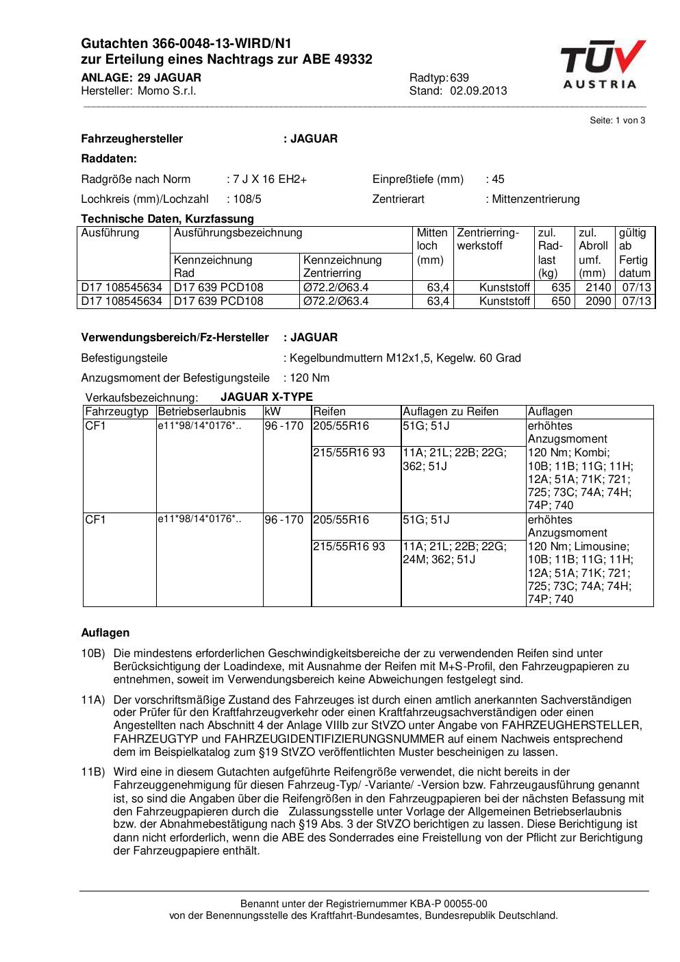 Felgengutachten / ABE für Alufelgen Momo EUROPE (7Jx16 ET 0, Mittenloch 0 mm) mit KBA 49332 (Zertifikatsnummer 366-0048-13-WIRD/N1__Anlage_29). Hier kostenlos als PDF herunterladen. Der Download-Link ist 24 Stunden gültig und kann bis zu zwei Mal verwendet werden.