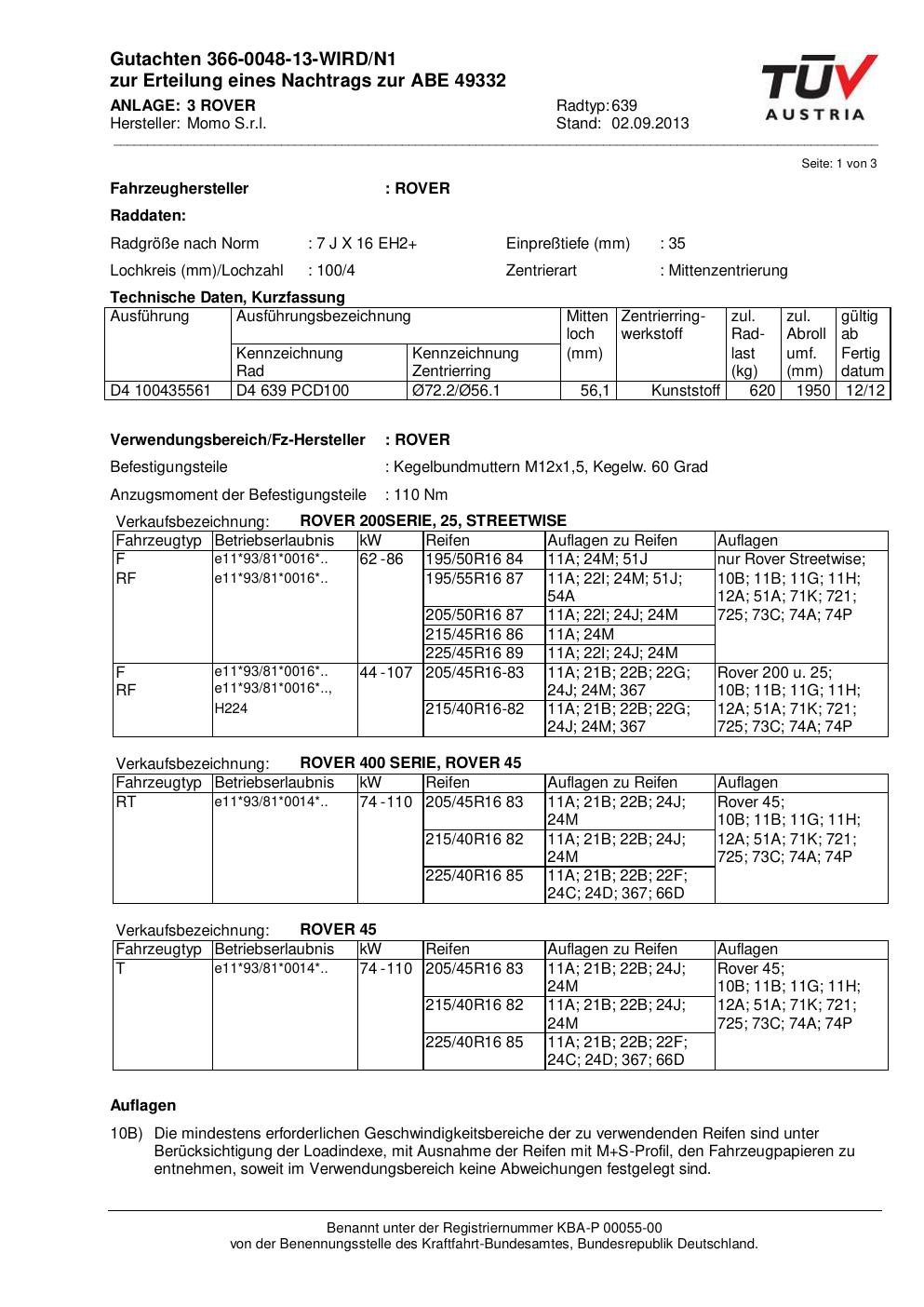 Dieses Gutachten (ABE) bezieht sich auf die Alufelge Momo EUROPE in der Ausführung 7Jx16 ET 0, Mittenloch 0 mm (KBA 49332). Im PDF findest du typischerweise zulässige Reifengrößen, Auflagen/Anbauhinweise und – je nach Dokument – Hinweise zur Eintragung.
