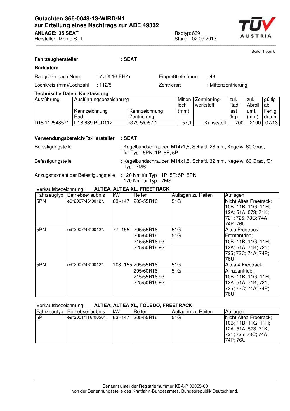 Felgengutachten / ABE für Alufelgen Momo EUROPE (7Jx16 ET 0, Mittenloch 0 mm) mit KBA 49332 (Zertifikatsnummer 366-0048-13-WIRD/N1__Anlage_35). Hier kostenlos als PDF herunterladen. Der Download-Link ist 24 Stunden gültig und kann bis zu zwei Mal verwendet werden.
