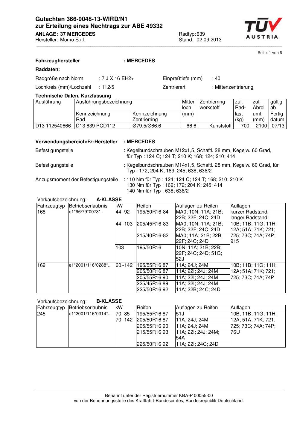 Dieses Gutachten (ABE) bezieht sich auf die Alufelge Momo EUROPE in der Ausführung 7Jx16 ET 0, Mittenloch 0 mm (KBA 49332). Im PDF findest du typischerweise zulässige Reifengrößen, Auflagen/Anbauhinweise und – je nach Dokument – Hinweise zur Eintragung.