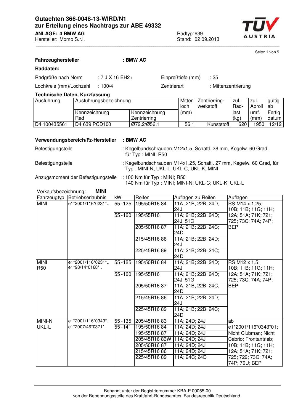 Felgengutachten / ABE für Alufelgen Momo EUROPE (7Jx16 ET 0, Mittenloch 0 mm) mit KBA 49332 (Zertifikatsnummer 366-0048-13-WIRD/N1__Anlage_4). Hier kostenlos als PDF herunterladen. Der Download-Link ist 24 Stunden gültig und kann bis zu zwei Mal verwendet werden.