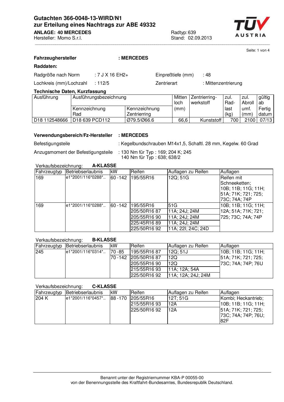 Dieses Gutachten (ABE) bezieht sich auf die Alufelge Momo EUROPE in der Ausführung 7Jx16 ET 0, Mittenloch 0 mm (KBA 49332). Im PDF findest du typischerweise zulässige Reifengrößen, Auflagen/Anbauhinweise und – je nach Dokument – Hinweise zur Eintragung.