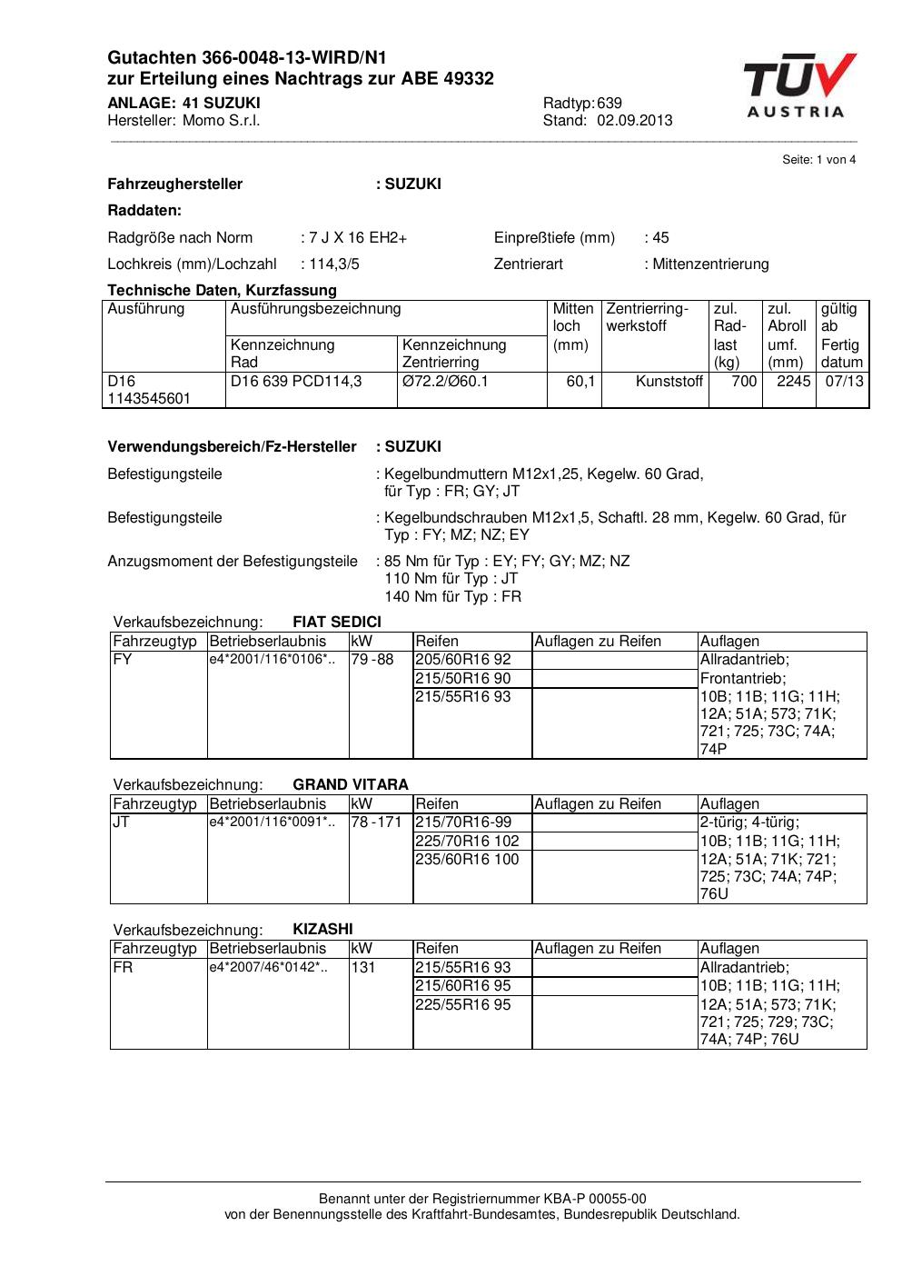 Dieses Gutachten (ABE) bezieht sich auf die Alufelge Momo EUROPE in der Ausführung 7Jx16 ET 0, Mittenloch 0 mm (KBA 49332). Im PDF findest du typischerweise zulässige Reifengrößen, Auflagen/Anbauhinweise und – je nach Dokument – Hinweise zur Eintragung.