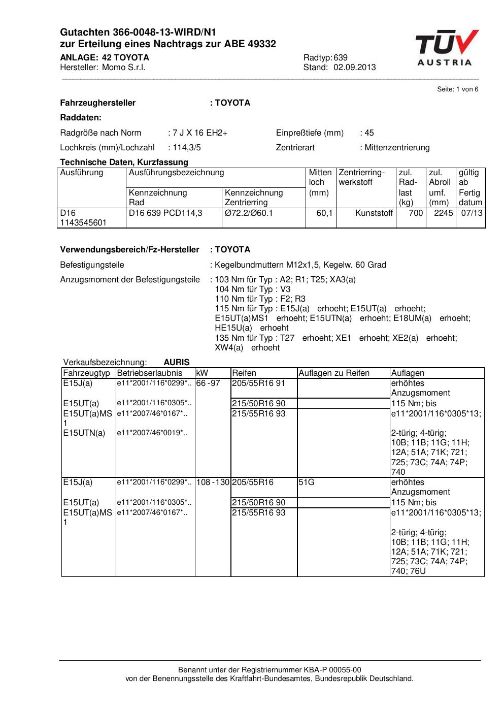 Dieses Gutachten (ABE) bezieht sich auf die Alufelge Momo EUROPE in der Ausführung 7Jx16 ET 0, Mittenloch 0 mm (KBA 49332). Im PDF findest du typischerweise zulässige Reifengrößen, Auflagen/Anbauhinweise und – je nach Dokument – Hinweise zur Eintragung.
