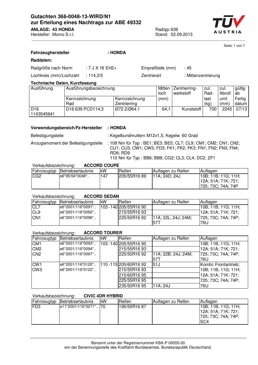 Felgengutachten / ABE für Alufelgen Momo EUROPE (7Jx16 ET 0, Mittenloch 0 mm) mit KBA 49332 (Zertifikatsnummer 366-0048-13-WIRD/N1__Anlage_43). Hier kostenlos als PDF herunterladen. Der Download-Link ist 24 Stunden gültig und kann bis zu zwei Mal verwendet werden.