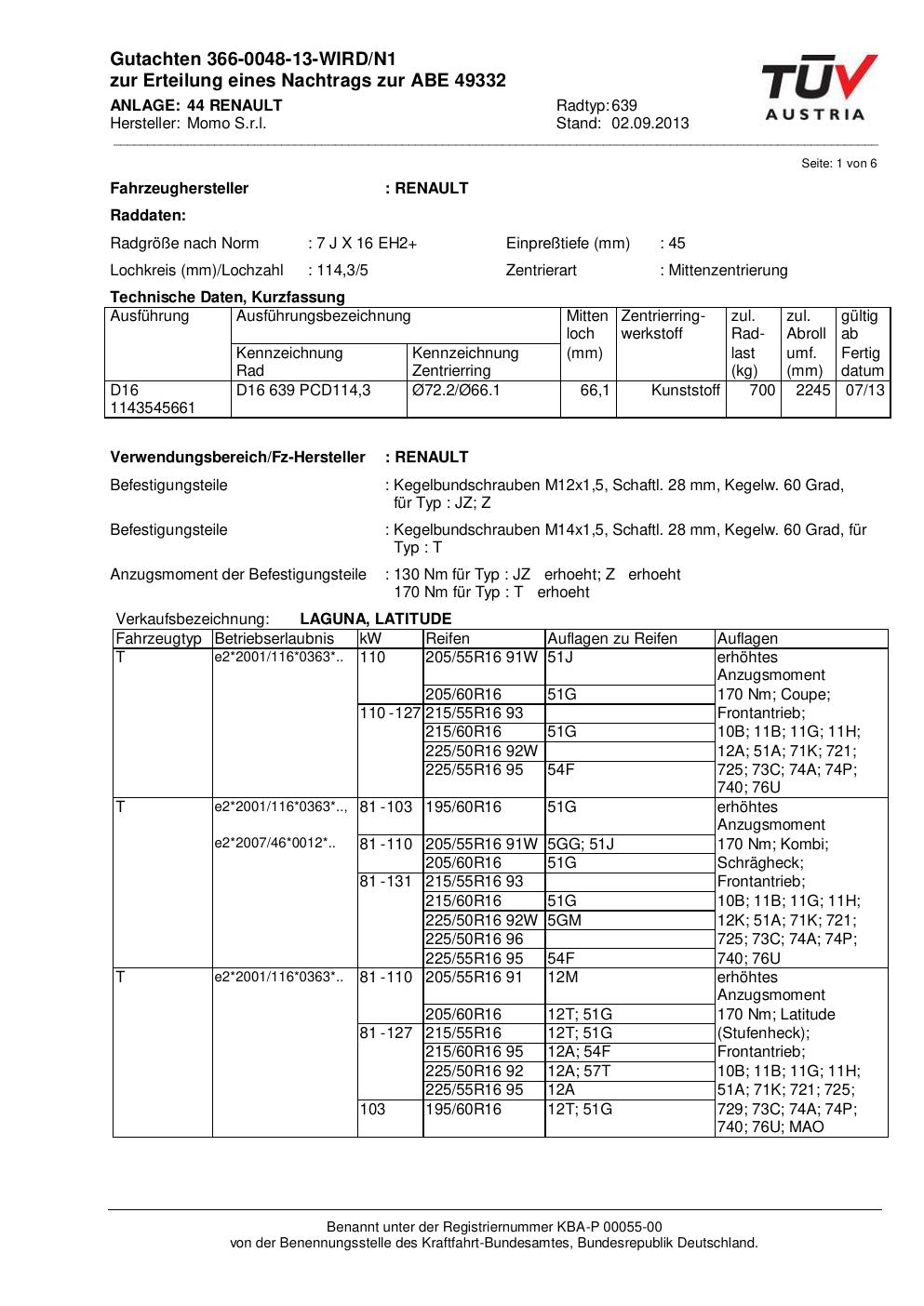 Felgengutachten / ABE für Alufelgen Momo EUROPE (7Jx16 ET 0, Mittenloch 0 mm) mit KBA 49332 (Zertifikatsnummer 366-0048-13-WIRD/N1__Anlage_44). Hier kostenlos als PDF herunterladen. Der Download-Link ist 24 Stunden gültig und kann bis zu zwei Mal verwendet werden.