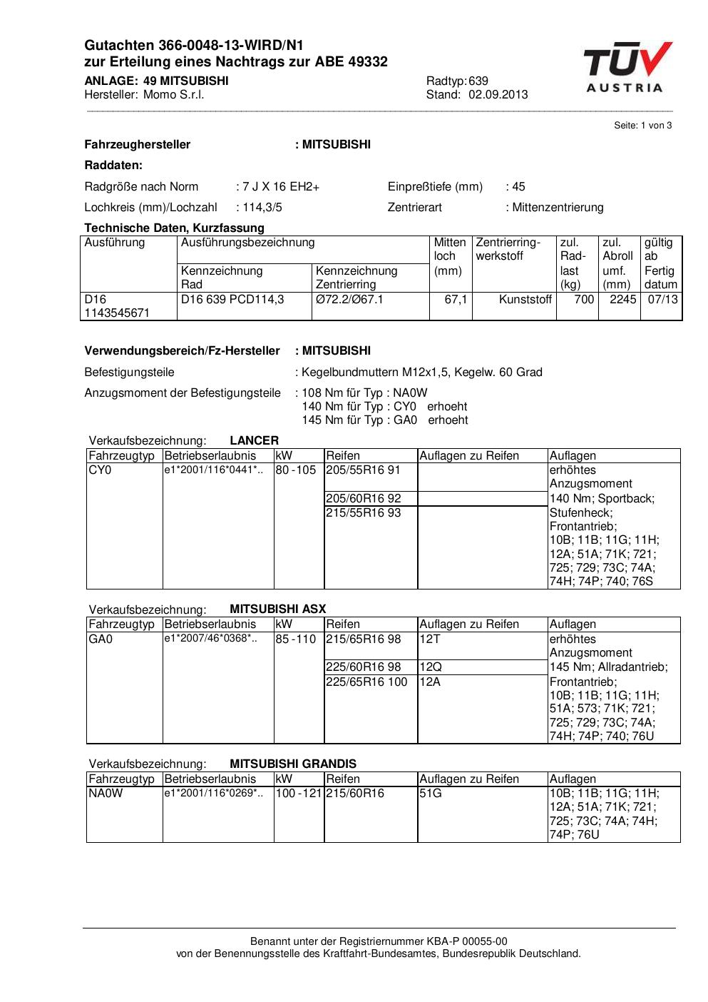 Dieses Gutachten (ABE) bezieht sich auf die Alufelge Momo EUROPE in der Ausführung 7Jx16 ET 0, Mittenloch 0 mm (KBA 49332). Im PDF findest du typischerweise zulässige Reifengrößen, Auflagen/Anbauhinweise und – je nach Dokument – Hinweise zur Eintragung.