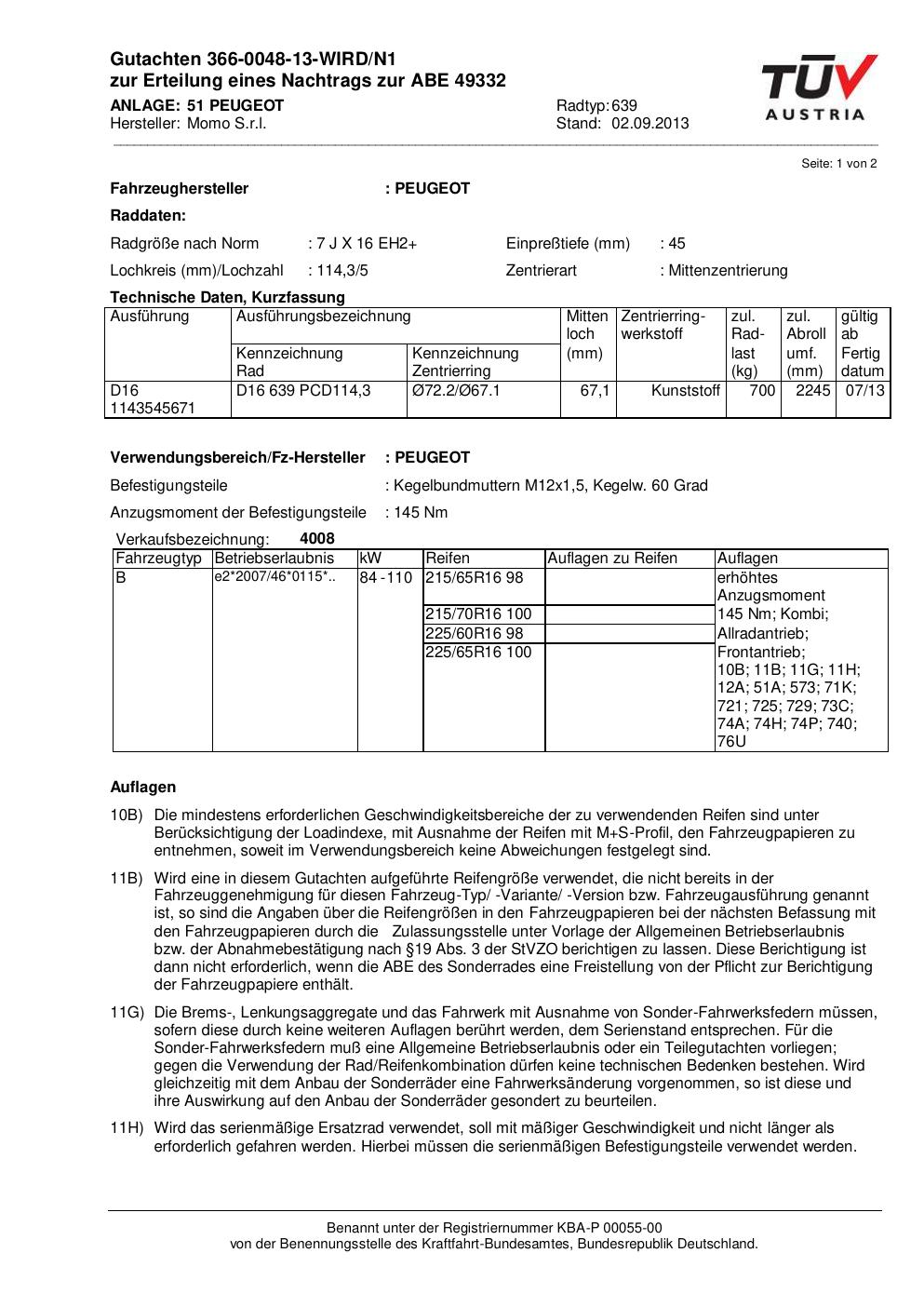 Felgengutachten / ABE für Alufelgen Momo EUROPE (7Jx16 ET 0, Mittenloch 0 mm) mit KBA 49332 (Zertifikatsnummer 366-0048-13-WIRD/N1__Anlage_51). Hier kostenlos als PDF herunterladen. Der Download-Link ist 24 Stunden gültig und kann bis zu zwei Mal verwendet werden.