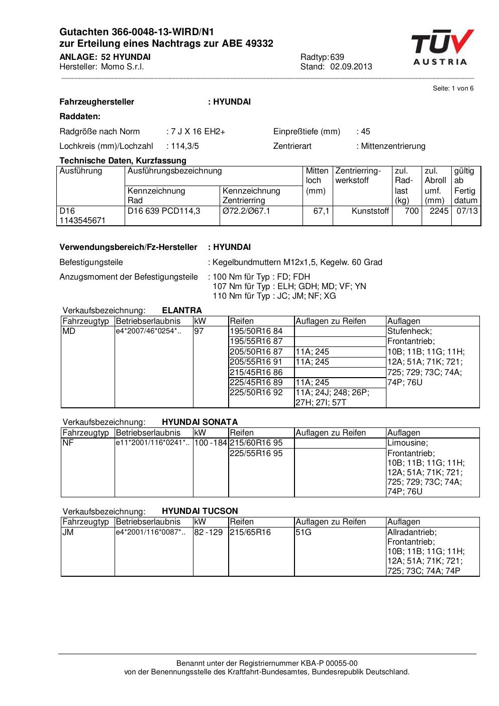 Felgengutachten / ABE für Alufelgen Momo EUROPE (7Jx16 ET 0, Mittenloch 0 mm) mit KBA 49332 (Zertifikatsnummer 366-0048-13-WIRD/N1__Anlage_52). Hier kostenlos als PDF herunterladen. Der Download-Link ist 24 Stunden gültig und kann bis zu zwei Mal verwendet werden.
