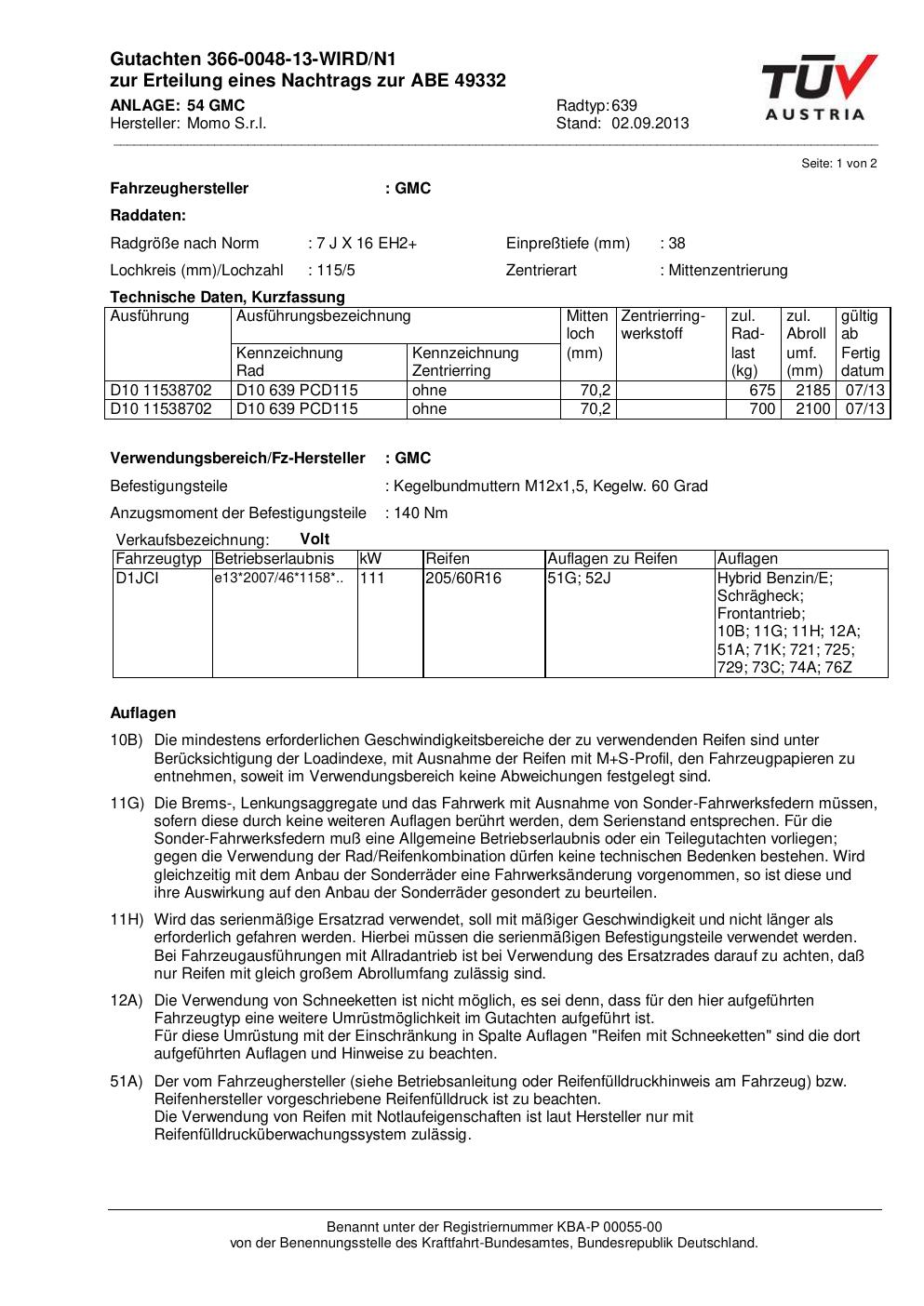 Dieses Gutachten (ABE) bezieht sich auf die Alufelge Momo EUROPE in der Ausführung 7Jx16 ET 0, Mittenloch 0 mm (KBA 49332). Im PDF findest du typischerweise zulässige Reifengrößen, Auflagen/Anbauhinweise und – je nach Dokument – Hinweise zur Eintragung.