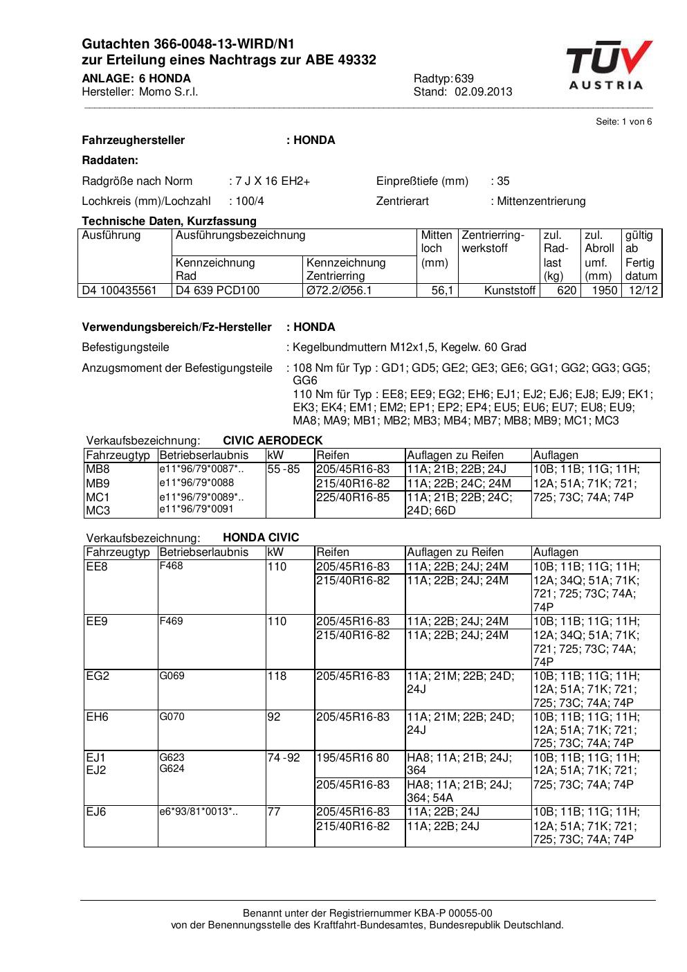 Felgengutachten / ABE für Alufelgen Momo EUROPE (7Jx16 ET 0, Mittenloch 0 mm) mit KBA 49332 (Zertifikatsnummer 366-0048-13-WIRD/N1__Anlage_6). Hier kostenlos als PDF herunterladen. Der Download-Link ist 24 Stunden gültig und kann bis zu zwei Mal verwendet werden.