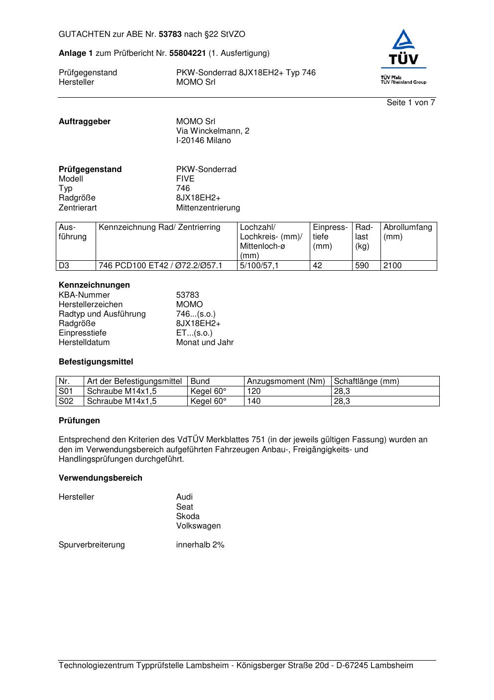 Felgengutachten / ABE für Alufelgen Momo FIVE (8Jx18 ET 0, Mittenloch 0 mm) mit KBA 53783 (Zertifikatsnummer 55804221__Anlage_1). Hier kostenlos als PDF herunterladen. Der Download-Link ist 24 Stunden gültig und kann bis zu zwei Mal verwendet werden.
