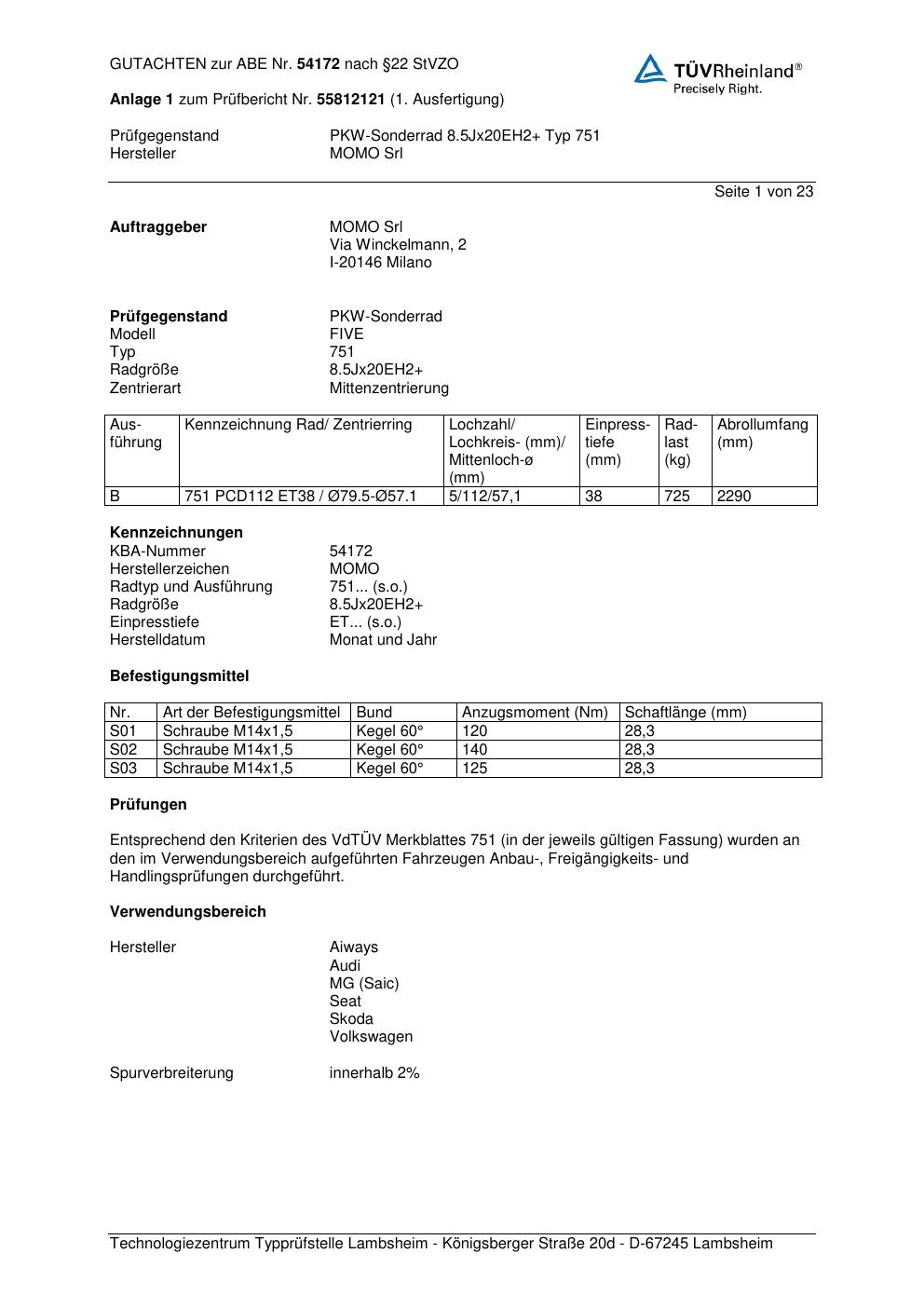 Felgengutachten / ABE für Alufelgen Momo FIVE (8.5Jx2 ET 0, Mittenloch 0 mm) mit KBA 54172 (Zertifikatsnummer 55812121__Anlage_1). Hier kostenlos als PDF herunterladen. Der Download-Link ist 24 Stunden gültig und kann bis zu zwei Mal verwendet werden.