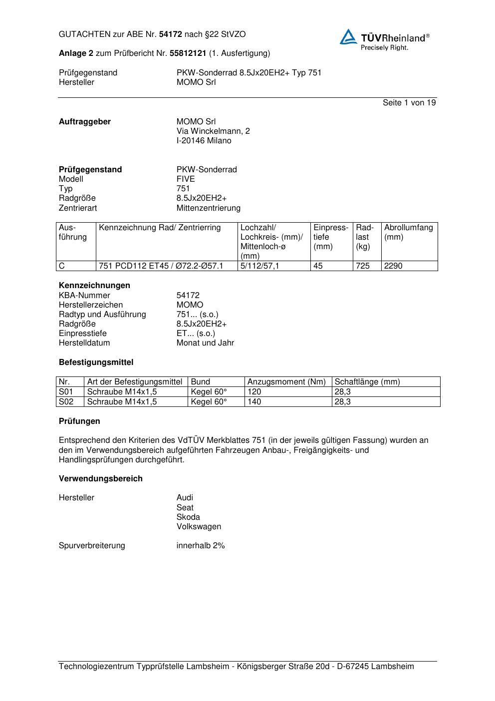 Felgengutachten / ABE für Alufelgen Momo FIVE (8.5Jx2 ET 0, Mittenloch 0 mm) mit KBA 54172 (Zertifikatsnummer 55812121__Anlage_2). Hier kostenlos als PDF herunterladen. Der Download-Link ist 24 Stunden gültig und kann bis zu zwei Mal verwendet werden.