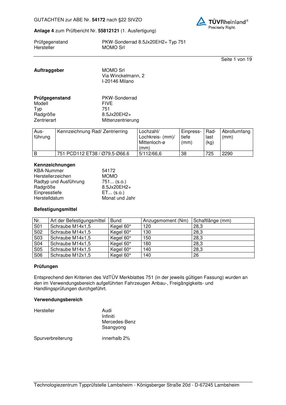 Felgengutachten / ABE für Alufelgen Momo FIVE (8.5Jx2 ET 0, Mittenloch 0 mm) mit KBA 54172 (Zertifikatsnummer 55812121__Anlage_4). Hier kostenlos als PDF herunterladen. Der Download-Link ist 24 Stunden gültig und kann bis zu zwei Mal verwendet werden.