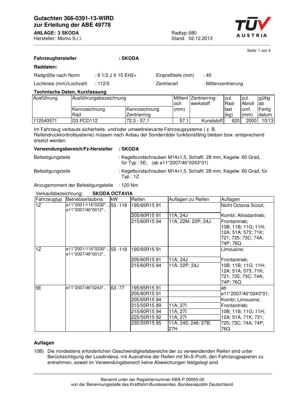 Felgengutachten / ABE für Alufelgen Momo HYPERSTAR (6.5Jx15 ET 0, Mittenloch 0 mm) mit KBA 49778 (Zertifikatsnummer 366-0391-13-WIRD__Anlage_3). Hier kostenlos als PDF herunterladen. Der Download-Link ist 24 Stunden gültig und kann bis zu zwei Mal verwendet werden.