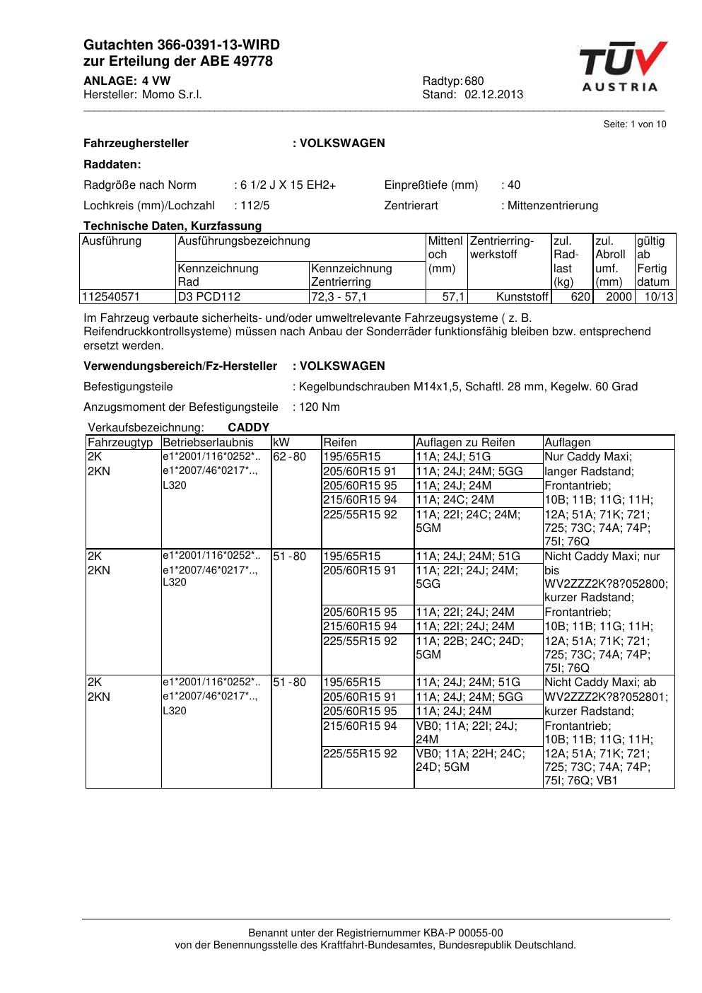 Felgengutachten / ABE für Alufelgen Momo HYPERSTAR (6.5Jx15 ET 0, Mittenloch 0 mm) mit KBA 49778 (Zertifikatsnummer 366-0391-13-WIRD__Anlage_4). Hier kostenlos als PDF herunterladen. Der Download-Link ist 24 Stunden gültig und kann bis zu zwei Mal verwendet werden.