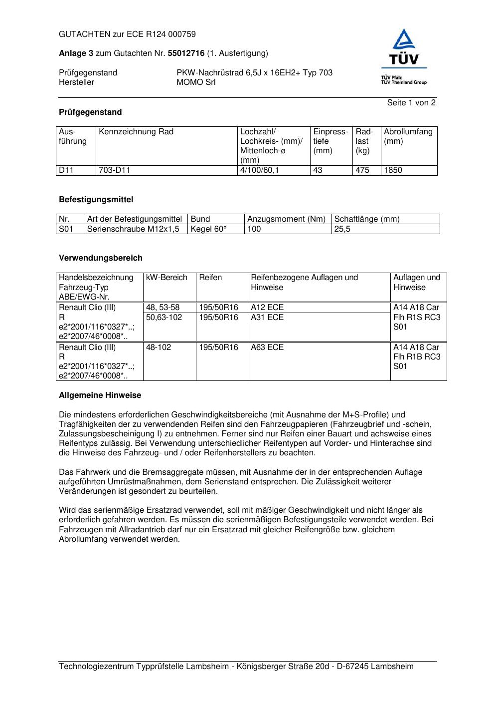 Felgengutachten / ABE für Alufelgen Momo HYPERSTAR (6.5Jx16 ET 0, Mittenloch 0 mm) mit KBA 000759 (Zertifikatsnummer 55012716__Anlage_3). Hier kostenlos als PDF herunterladen. Der Download-Link ist 24 Stunden gültig und kann bis zu zwei Mal verwendet werden.