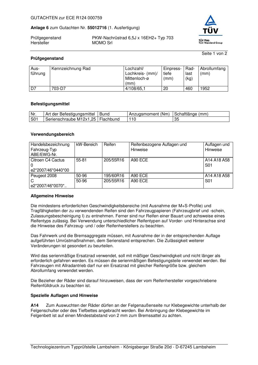Felgengutachten / ABE für Alufelgen Momo HYPERSTAR (6.5Jx16 ET 0, Mittenloch 0 mm) mit KBA 000759 (Zertifikatsnummer 55012716__Anlage_6). Hier kostenlos als PDF herunterladen. Der Download-Link ist 24 Stunden gültig und kann bis zu zwei Mal verwendet werden.