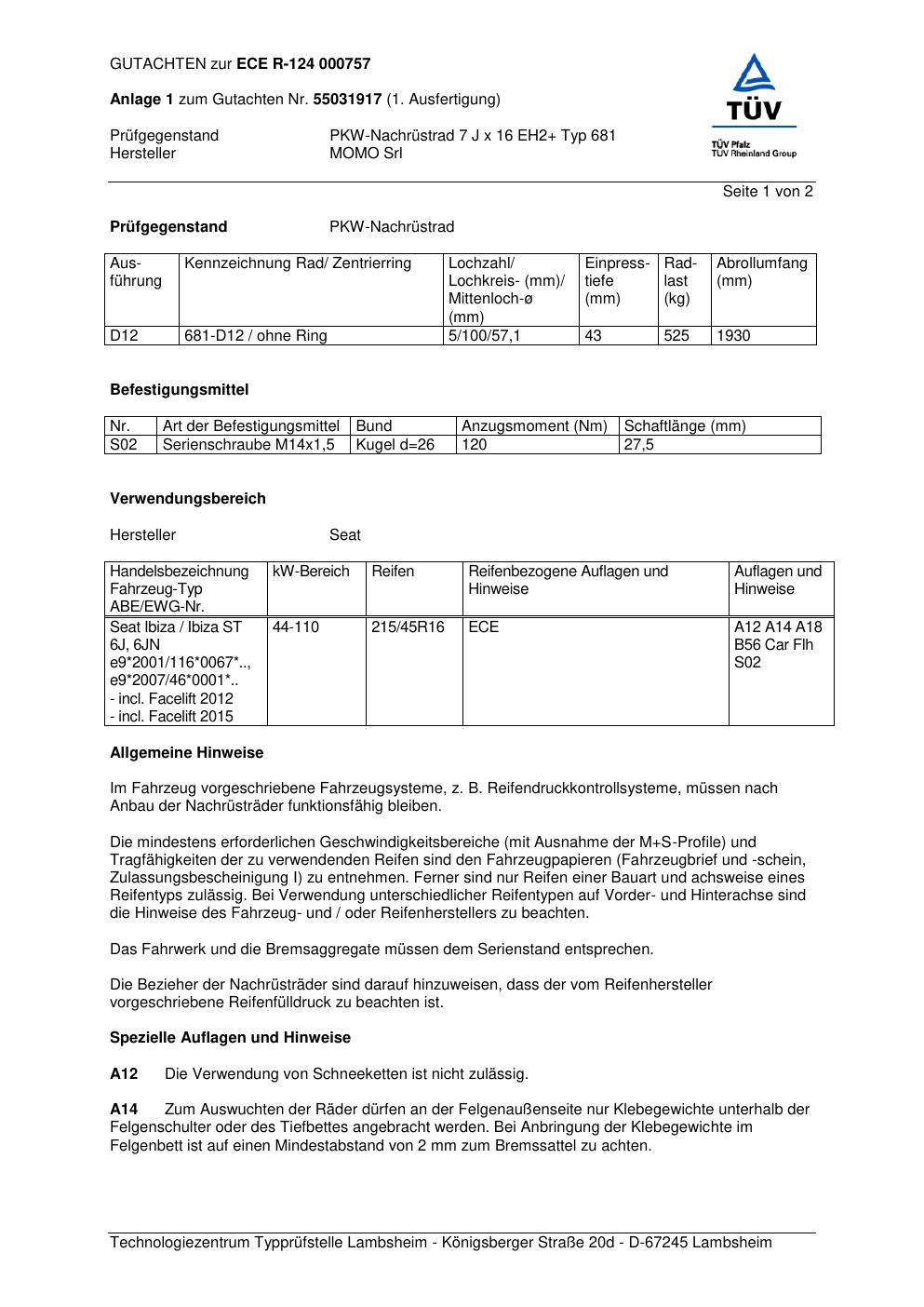 Felgengutachten / ABE für Alufelgen Momo HYPERSTAR (7Jx16 ET 0, Mittenloch 0 mm) mit KBA 000757 (Zertifikatsnummer 55031917__Anlage_1). Hier kostenlos als PDF herunterladen. Der Download-Link ist 24 Stunden gültig und kann bis zu zwei Mal verwendet werden.