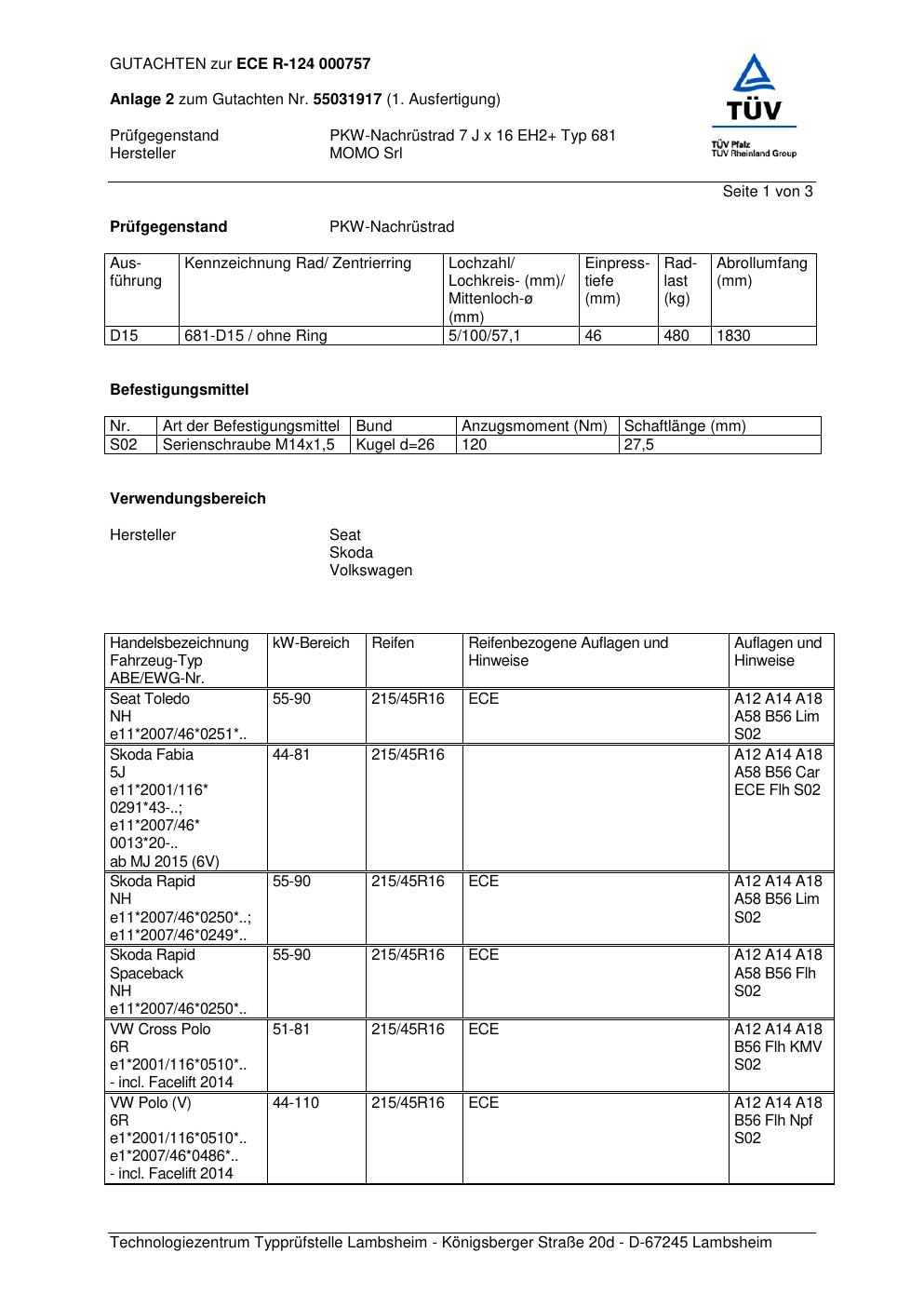 Felgengutachten / ABE für Alufelgen Momo HYPERSTAR (7Jx16 ET 0, Mittenloch 0 mm) mit KBA 000757 (Zertifikatsnummer 55031917__Anlage_2). Hier kostenlos als PDF herunterladen. Der Download-Link ist 24 Stunden gültig und kann bis zu zwei Mal verwendet werden.