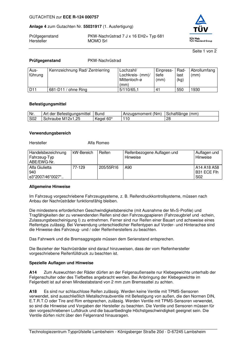 Felgengutachten / ABE für Alufelgen Momo HYPERSTAR (7Jx16 ET 0, Mittenloch 0 mm) mit KBA 000757 (Zertifikatsnummer 55031917__Anlage_4). Hier kostenlos als PDF herunterladen. Der Download-Link ist 24 Stunden gültig und kann bis zu zwei Mal verwendet werden.