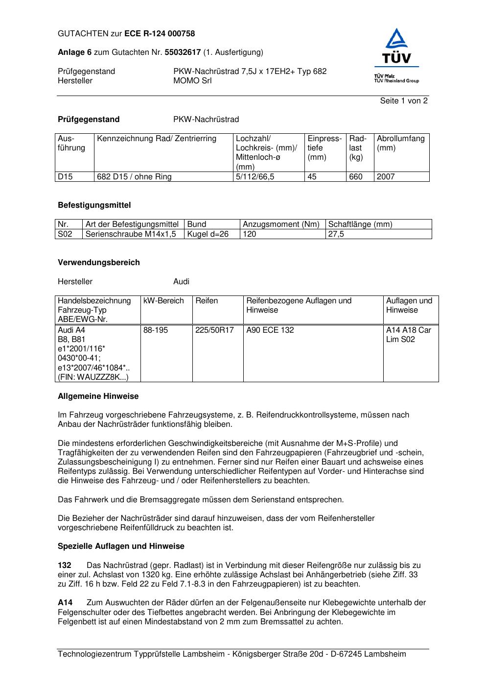 Felgengutachten / ABE für Alufelgen Momo HYPERSTAR (7.5Jx17 ET 0, Mittenloch 0 mm) mit KBA 000758 (Zertifikatsnummer 55032617__Anlage_6). Hier kostenlos als PDF herunterladen. Der Download-Link ist 24 Stunden gültig und kann bis zu zwei Mal verwendet werden.