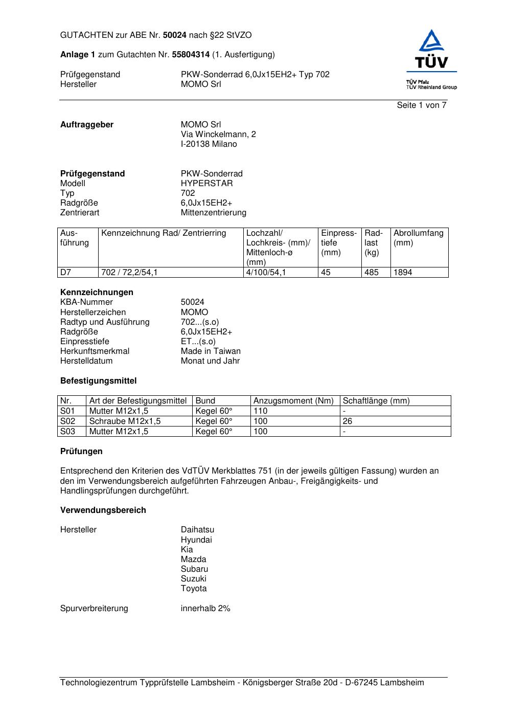Felgengutachten / ABE für Alufelgen Momo HYPERSTAR (6Jx15 ET 0, Mittenloch 0 mm) mit KBA 50024 (Zertifikatsnummer 55804314__Anlage_1). Hier kostenlos als PDF herunterladen. Der Download-Link ist 24 Stunden gültig und kann bis zu zwei Mal verwendet werden.